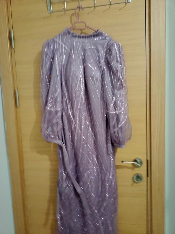 Yüksek yakalı, uzun kollu ve bol kesimli bu uzun mor gece elbisesi, drapeli tasarımı ve batik deseniyle bohem ve avangart bir görünüm sunar. astarlı bel kemerli kusuru ufak bir yandan elle bile dikilebilecek küçük bir sökük var foto atılır 40 bedenede rahatlıkla giyer