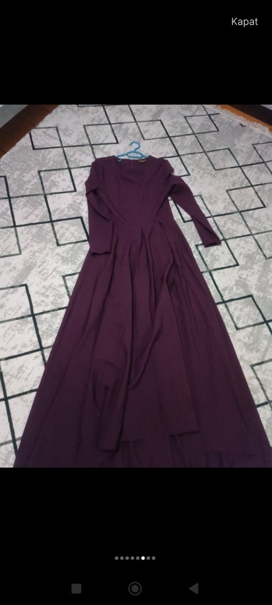 Uzun kollu, V yaka ve drapeli tasarıma sahip, mor renkli, vücuda oturan uzun elbise. Minimalist ve mütevazı gotik stile uygun, sentetik kumaştan üretilmiştir.