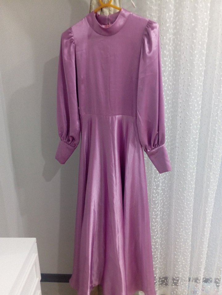 Pastel mor renkte, uzun kollu ve yüksek yakalı, bol kesim saten kumaştan yapılmış drapeli uzun elbise. Çağdaş vintage tarzda, düğünler için uygun.