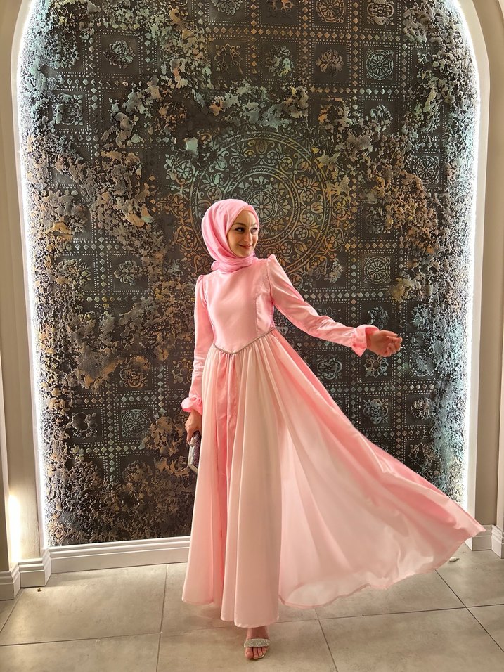 Yüksek yakalı, uzun kollu, yumuşak pastel pembe kumaştan, bol ve drapeli kesime sahip uzun abiye elbise.36-38 e uyumlu. Düğünler için uygun, zarif ve saten ışıltılı tarzda.