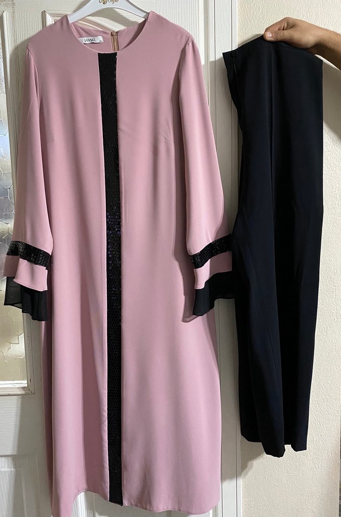 Uzun boy pembe kadın elbisesi, uzun kollu ve kesimli yakaya sahip. Drapeli tasarımı ve siyah detayları ile ofis için uygundur. Sentetik kumaştan yapılmıştır.