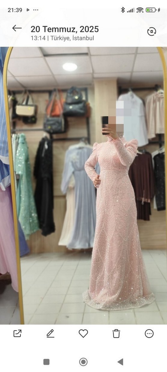 Bu pembe pastel renkte, uzun kollu ve yüksek yakalı nişan elbisesi, drapeli tasarımı ve uzun kesimiyle şık ve mütevazı bir görünüm sunar. ✨