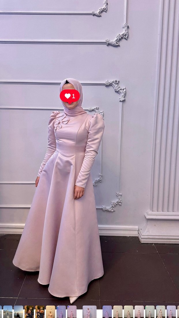 Uzun kol, yüksek yakalı ve drapeli detaylara sahip açık pembe, fit kesim tesettür abiye. Çağdaş ve avangart tarzıyla düğünler için uygun. Kiralama yapılır .