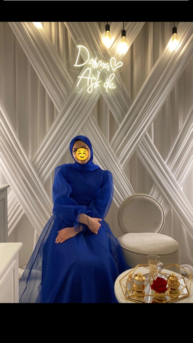 Uzun kol ve yüksek yakalı, drapeli detaylı lacivert tesettür abiye. Modest ve çağdaş tarzda, avant-garde düğünler için uygundur. Hiç bir yerinde hiç bir sorun mevcut değildir sadece bir kaç kere giydim içinde prenses gibi hissedersiniz ben çok memnun kaldım sözümde giydiğim için tekrar giymeyi tercih etmedim tekliflere açığım