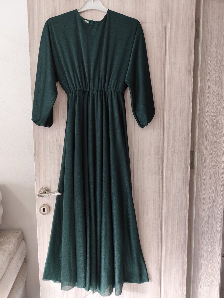 Uzun kollu, drapeli, bol kesim ve yuvarlak yakalı koyu yeşil elbise. Yumuşak sentetik kumaştan, minimal ve bohem tarzda günlük kullanıma uygun üstünde ayni kumastan sali hediye verilecektir 38-40-42 bedene uyumludur