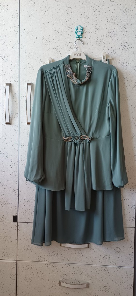Uzun Kol Drapeli Turkuaz Abiye Elbise