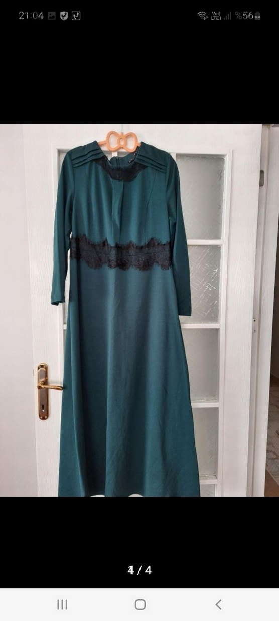 Uzun kollu, tek renkli ve drapeli tasarıma sahip turkuaz elbise. Tekne yaka ve dantel detaylı, günlük kullanıma uygun klasik kesim.