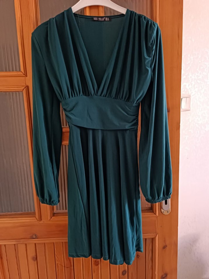 Uzun kollu, v yaka ve drapeli tasarıma sahip, klasik ve vintage tarzı birleştiren turkuaz renkli, oturan kesim kadın elbisesi.