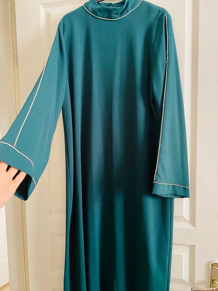 Turkuaz renkli, uzun kollu ve yüksek yakalı bu elbise, drapeli detaylara sahip. Düzenli kesimi ve minimal parlak dokusuyla günlük kullanıma uygundur. ✨
