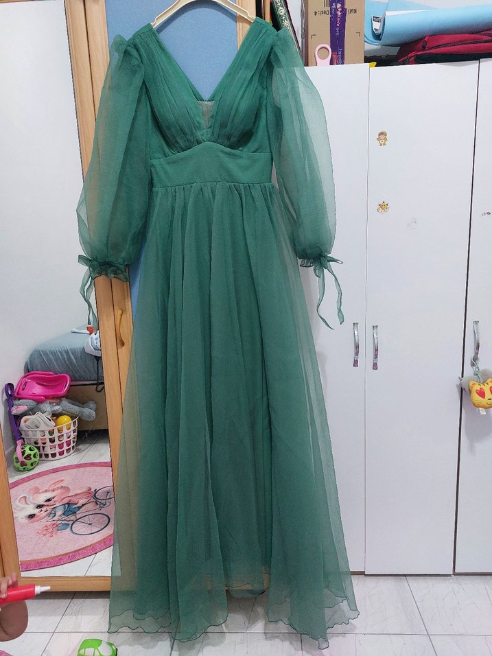 Uzun, yeşil renkte, V yakalı ve bilekte bağcıklı uzun tüllü kollara sahip drapeli, bol kesim bohem elbisedir.