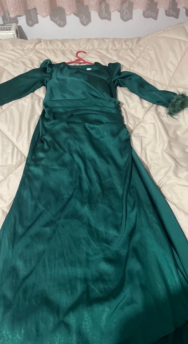Uzun kol ve V yaka ile drapeli, yeşil parlak kumaştan yapılmış, klasik ve şık kadın abiye elbise. Fitted kesimi ve uzun boyu ile düğünlere uygundur.
