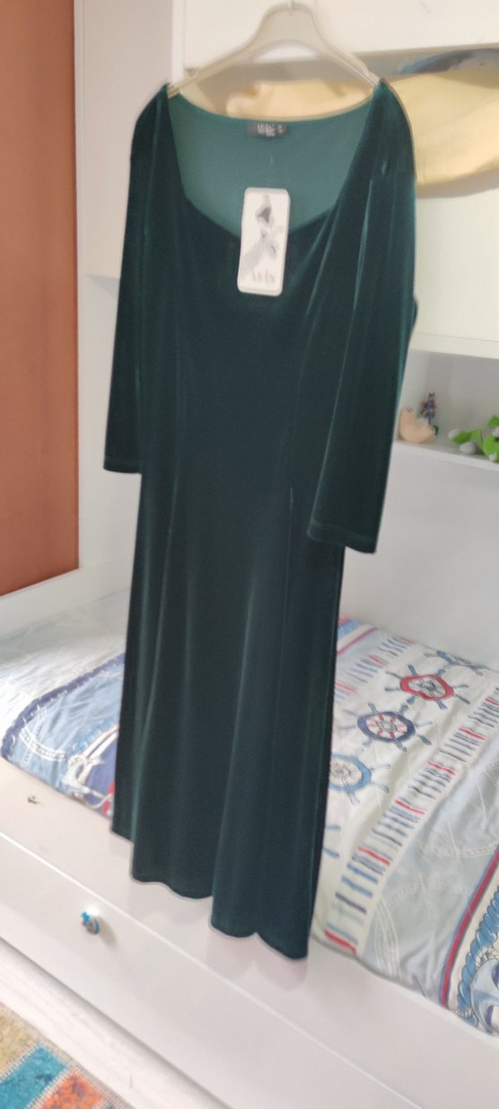 Uzun kolu ve kayık yaka detayları ile drapeli, rahat kesimli yeşil kadın elbisesi. Ofis kullanımı için uygun, sentetik dokulu kumaştan üretilmiştir.
