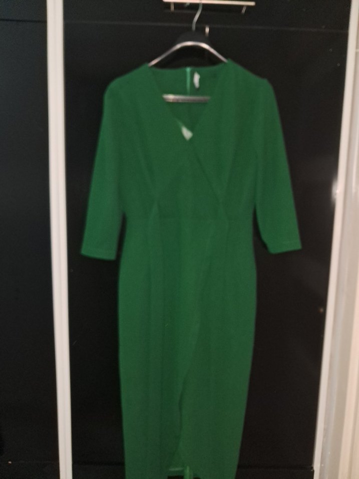 Drapeli tasarıma sahip uzun yeşil elbise, V yakalı ve uzun kolludur. Rahat kesim ve sentetik yumuşak kumaştan üretilmiştir, ofise uygundur. önüne çıt çıtı ben yaptırdım çıkartabilirsiniz ☺️ kuşağı önden de bağlanabilir
