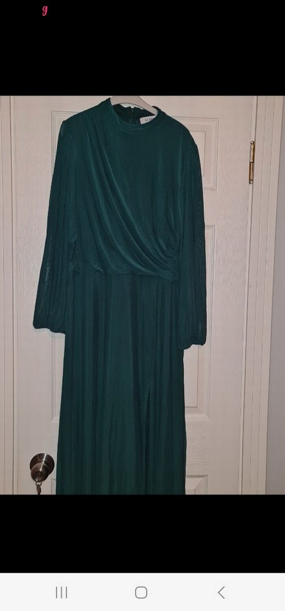 Drapeli detaylara sahip, uzun kollu ve yüksek yakalı bu yeşil elbise, yumuşak sentetik kumaştan üretilmiştir. Mütevazı ve bohem tarzlar için uygundur, düğünlerde tercih edilir.