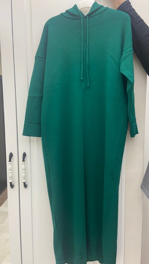 Kadınlar için uzun, bol kesim, uzun kollu ve yuvarlak yakalı yeşil spor elbise. Yumuşak sentetik kumaştan, drapeli tasarıma sahip, günlük kullanıma uygun.