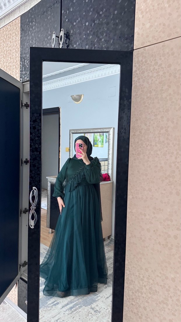 Uzun Kol Drapeli Yeşil Tesettür Abiye Elbise