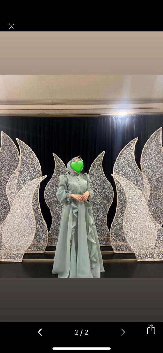 Uzun kol, yüksek yakalı, drapeli tasarıma sahip bu haki renk kadın elbisesi, düzenli kesim ve desenlidir. Düğün için uygun, mütevazı ve avangart tarzda.