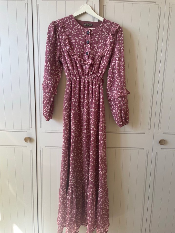 Bordo renkli, uzun kollu ve düğmeli, V yakalı bol kesim bohem elbise. Pastel tonlarda batik desenlidir.