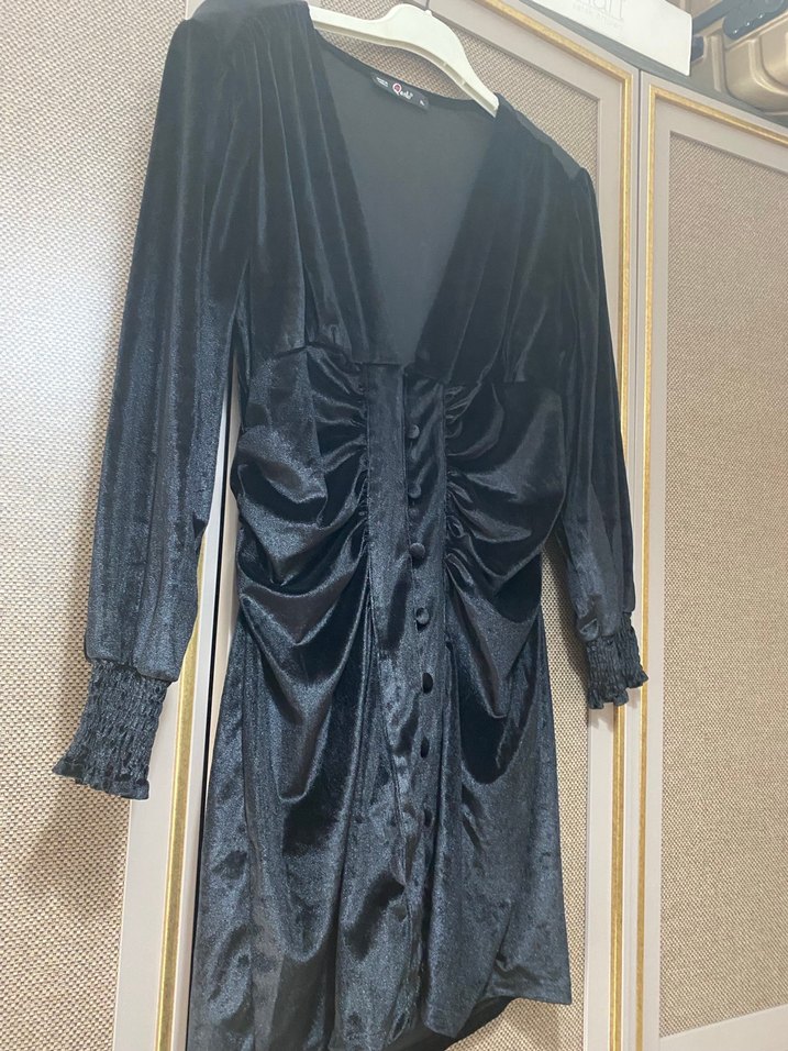 Düğmeli, uzun kollu ve V yakalı siyah gotik tarzda, vücuda oturan mini elbise, romantik akşamlar için uygun.