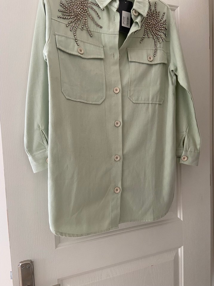 Düğmeli ön cep detaylı, uzun kol ve uzun kesim yeşil denim gömlek, salaş kesimiyle rahat bir sokak stili sunar.