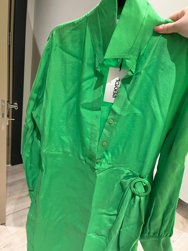 Yeşil, parlak ve ipeksi kumaştan yapılmış, uzun kollu, düğmeli ve yakalı, bol kesim kadın gömleği. Ofis için uygundur.