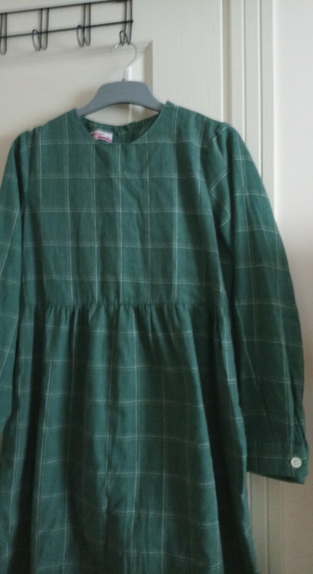 Uzun kol, yuvarlak yaka ve düğmeli detaylara sahip, keten kumaştan yapılmış bol kesim yeşil elbise. Vintage normcore tarzında, hafif kareli deseni vardır.