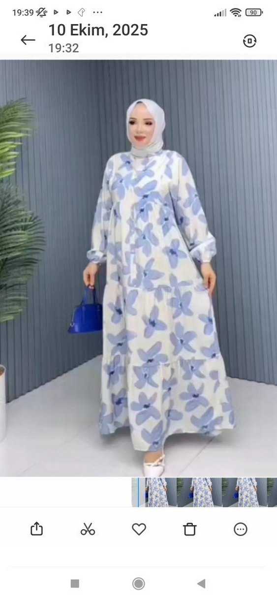 Modal kumaş Pinterest elbise Kadınlar için uzun, bol kesim elbise. Uzun kollu ve yüksek yakalı, açık mavi bağlama desenli, fırfır detaylı, yumuşak sentetik kumaştan üretilmiştir.