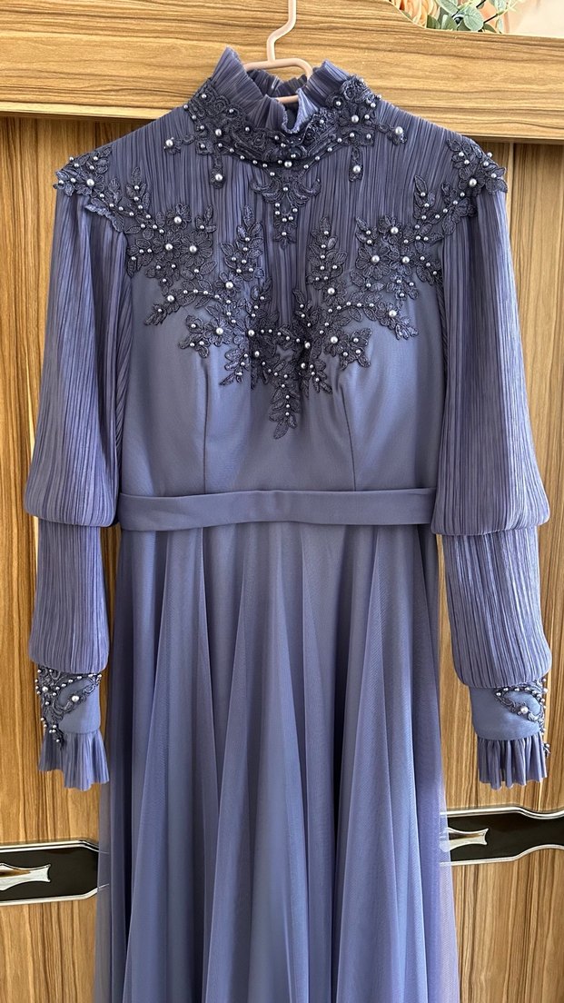 Yüksek yakalı, işlemeli detaylara sahip uzun kol ve drapeli uzun indigo mavisi abiye elbise. Modern klasik tarzda, düğünler için uygun.