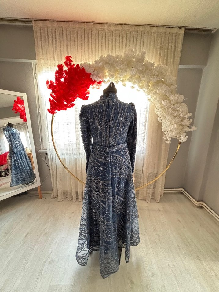 Yüksek yakalı, uzun kollu, işlemeli ve drapeli uzun mavi elbise. Bohem tarzda, düğünler için uygun, regular fit kesim.