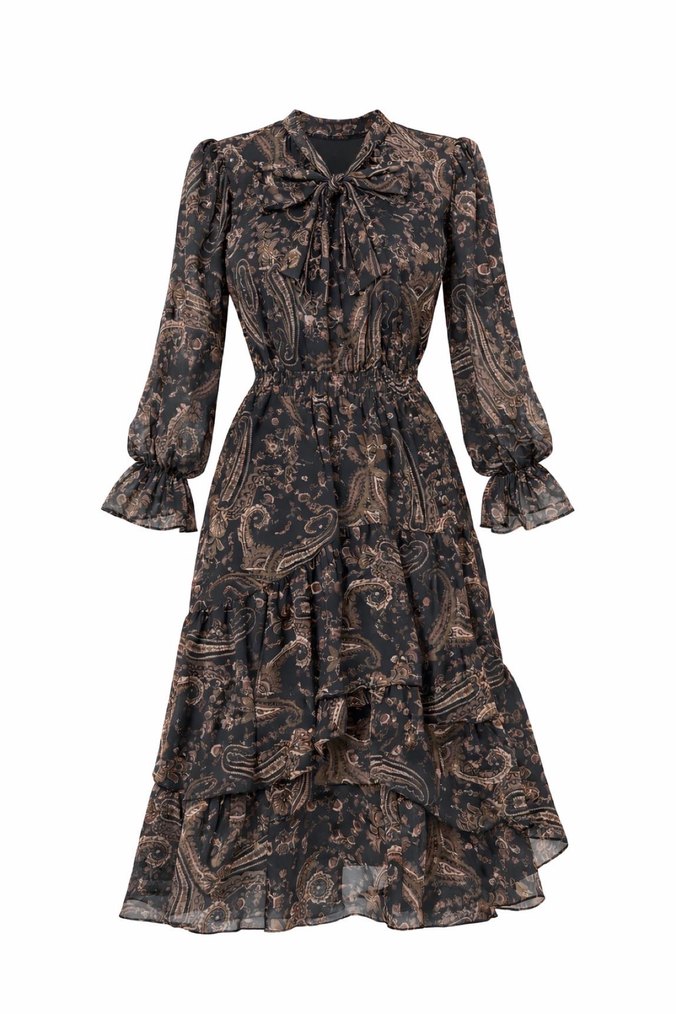 Kahverengi desenli sentetik kumaştan, uzun kollu ve bol kesim bohem tarzda elbise. Yaka yüksek ve fırfır detaylı, ofis için uygun.