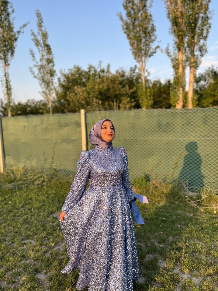 Uzun kollu, yüksek yakalı mavi bağlama desenli elbise. Drapeli, salaş kesimiyle tesettür ve bohem tarzda, düğünlere uygun. parıl parıl bir abiye gören herkes nerden aldigimi sordu kaçirmayin