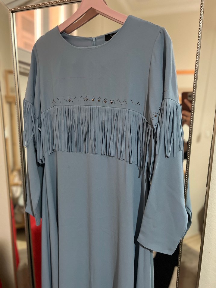 Uzun kol, yuvarlak yaka ve nakış detaylı mavi uzun elbise, bohem tarzda bol kesim ve fırfır süslemelidir.