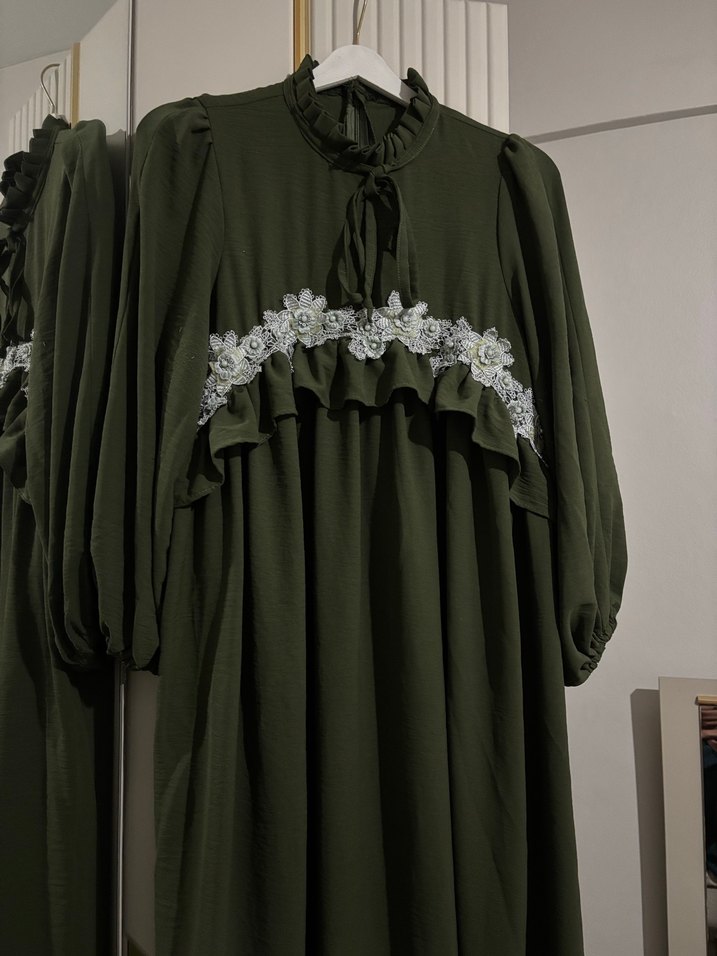 Haki renkli uzun elbise, yüksek yakalı ve uzun kolludur. Nakışlı çiçek detayları ve fırfırlar içerir. Aerobin kumaştır, bol kesimdir. Koltuk alt kısmında hafif tüylenme vardır başkada sorunu yok elbise boy 131cm