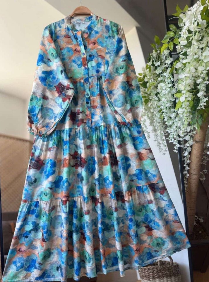 Pastel renkli batik desenli, uzun kollu, salaş kesim, tekne yaka ve fırfır detaylı sentetik kumaş bohem elbise. KUMAŞI:LİLYUM KUMAŞTIR❤️ BEDEN ARALIĞI:38/50 ELBİSE BOY:1.40 ÇEKME YAPMAZ ÜTÜ İSTEMEZ İSTEDİĞİNİZ BEDENDE İLAN AÇILIR