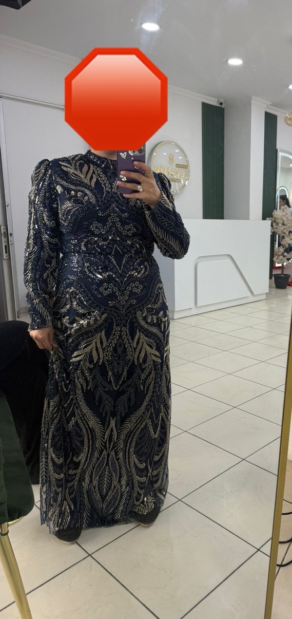 Uzun kollu, yüksek yakalı ve vücuda oturan bu abiye elbise koyu lacivert, payetli ve desenlidir. Bohem ve sade tarzıyla düğünler için uygundur. ✨ Kardeşimin kınasında bir kaç saat olarak giyildi, 46 beden uyumlu