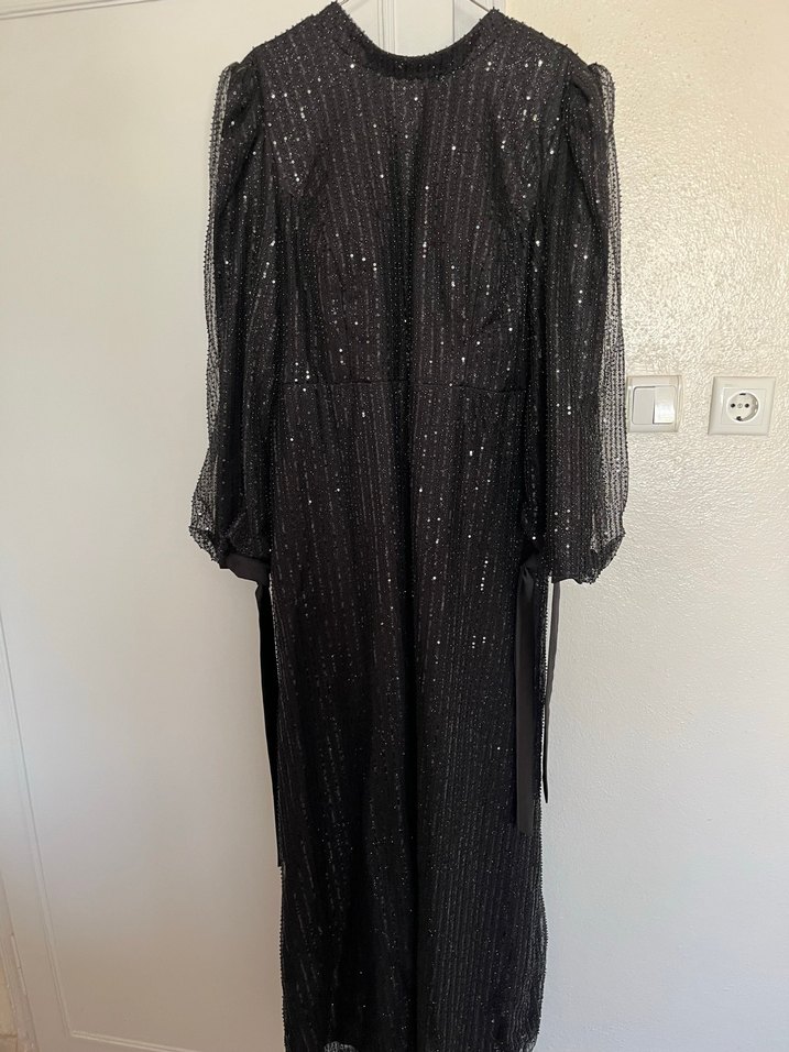 Uzun kol ve bisiklet yaka detaylı, drapeli, siyah renkli, hafif ışıltılı, bol kesim abiye elbise. Romantik akşamlar için uygun. Hiçbir kusuru yoktur