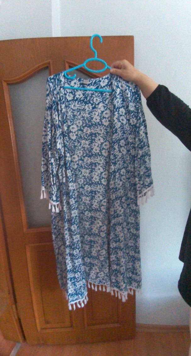 Uzun boy, bol kesim, uzun kollu ve püsküllü detaylara sahip kadın kimono. Mavi ve gri batik desenli, yuvarlak yaka, tekstil kumaştan üretilmiştir. Günlük kullanıma uygundur.