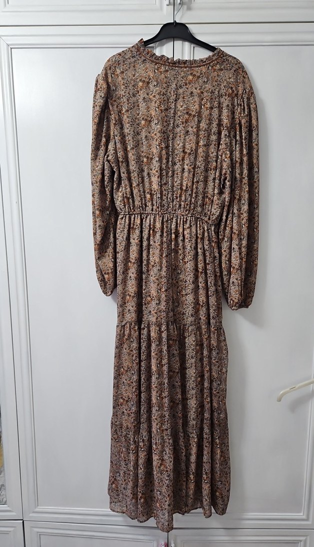 Uzun kollu, bol kesim bohem elbise; kahverengi ve gri tonlarında renk geçişli desene sahiptir. Yuvarlak yaka ve fırfır detaylı, yumuşak sentetik kumaştan üretilmiştir.