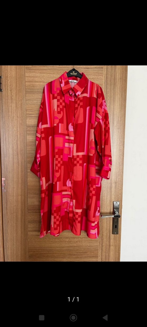 Renkli tie-dye desenli, uzun ve bol kesim kadın gömlek. Tekneler yaka ve düğmeli ön detaylarıyla bohem tarzını yansıtıyor.