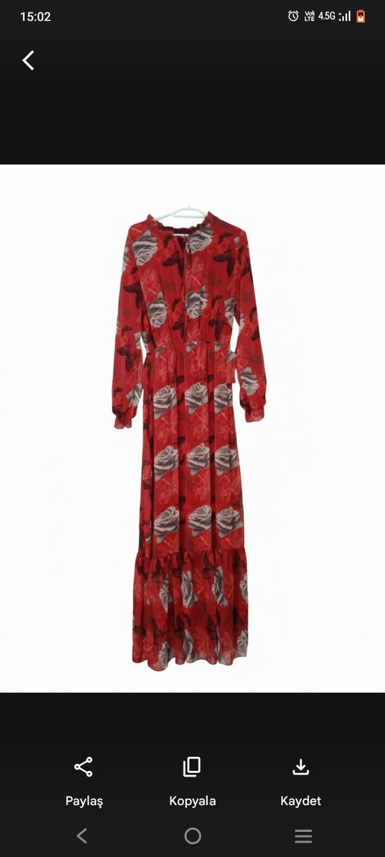 Renkli batik desenli, uzun kollu, bol kesim kadın elbisesi. Yumuşak sentetik kumaştan, yüksek yakalı ve fırfırlı detaylı bohem tarzda.