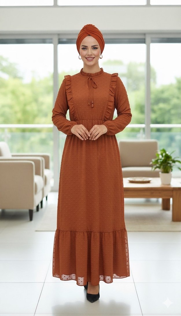 Uzun Kol Robalı Kahverengi Tesettür Elbise