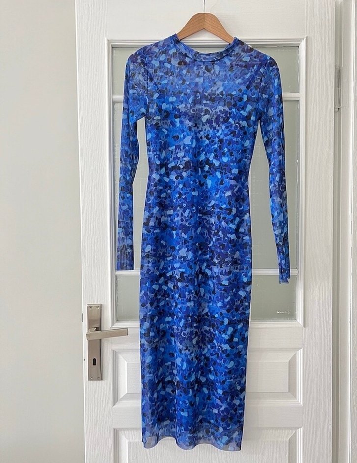 Bu uzun, vücuda oturan elbise koyu mavi batik deseni, yüksek yaka ve uzun kollara sahiptir. Şeffaf sentetik kumaştan yapılmış olup, günlük kullanım için çağdaş Paris tarzı sunar.