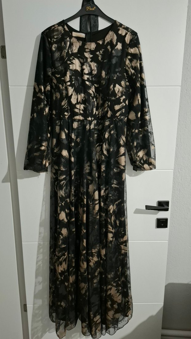 Siyah uzun elbise, batik desenli, salaş kesim ve drapeli tasarıma sahiptir. Sadece bir kez giyildi hatasız.