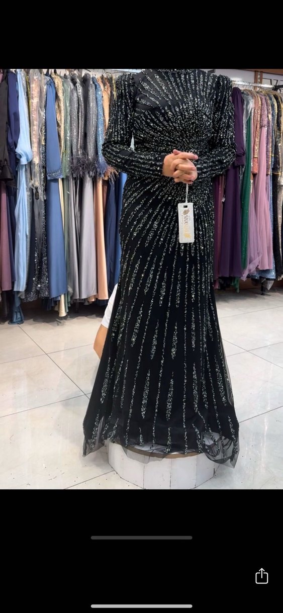 Uzun kollu, detaylı siyah abiye elbise. Bağlama desenli, modest ve regular kesim, düğün için uygun.