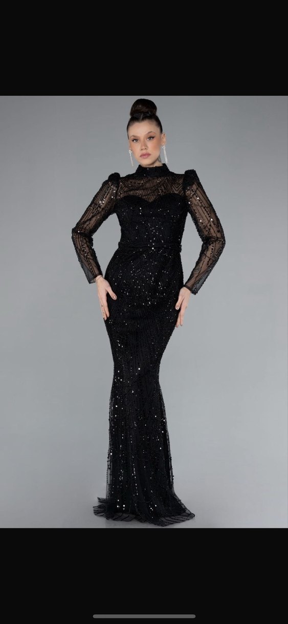 Uzun Kol Siyah Payetli V Yaka Abiye Elbise