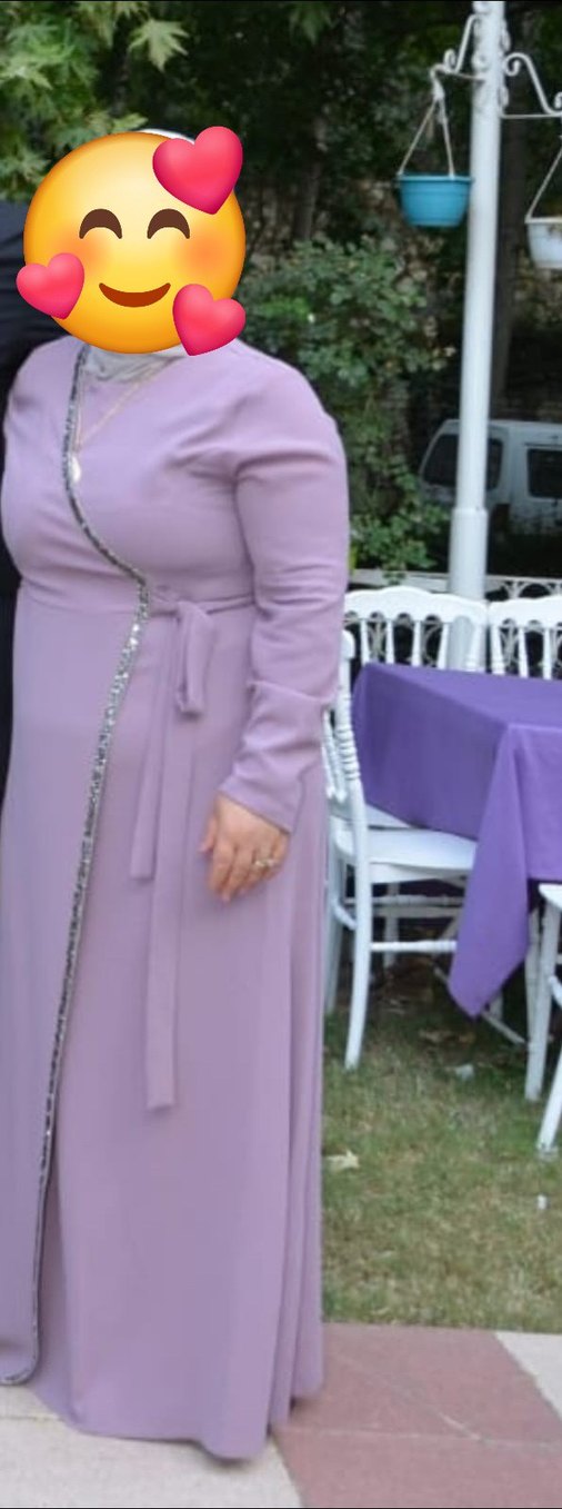 Uzun mor abiye elbise, drapeli detaylı ve oturan kesimlidir. Notlu yaka ve uzun kolludur, tesettürlü kullanıma uygundur. Desensiz ve şık bir tasarımdır.