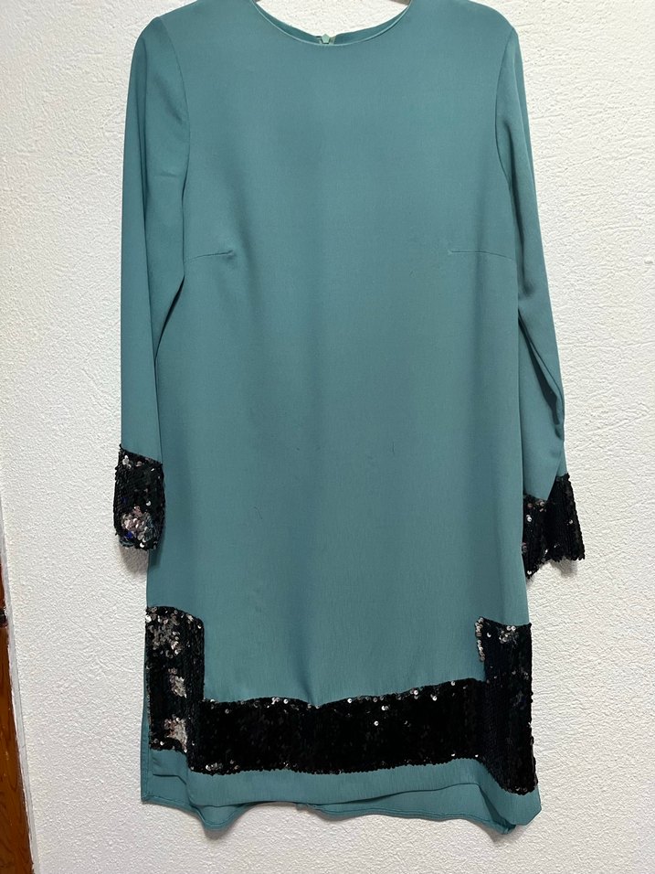 Uzun kollu, bol kesim turkuaz tunik, drapeli tasarım ve işlemeli detaylarla. Manşet ve etek ucunda siyah pul işlemeleri bulunur. Romantik akşamlar için uygun.