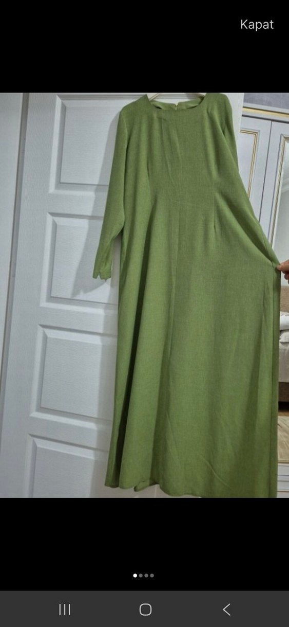 Fiyatta yardimci oluyorum.Parlak haki keten kumaştan, uzun kol, V yakalı, dökümlü ve bol kesim uzun elbise, sade ve mütevazı tarz için uygundur.
