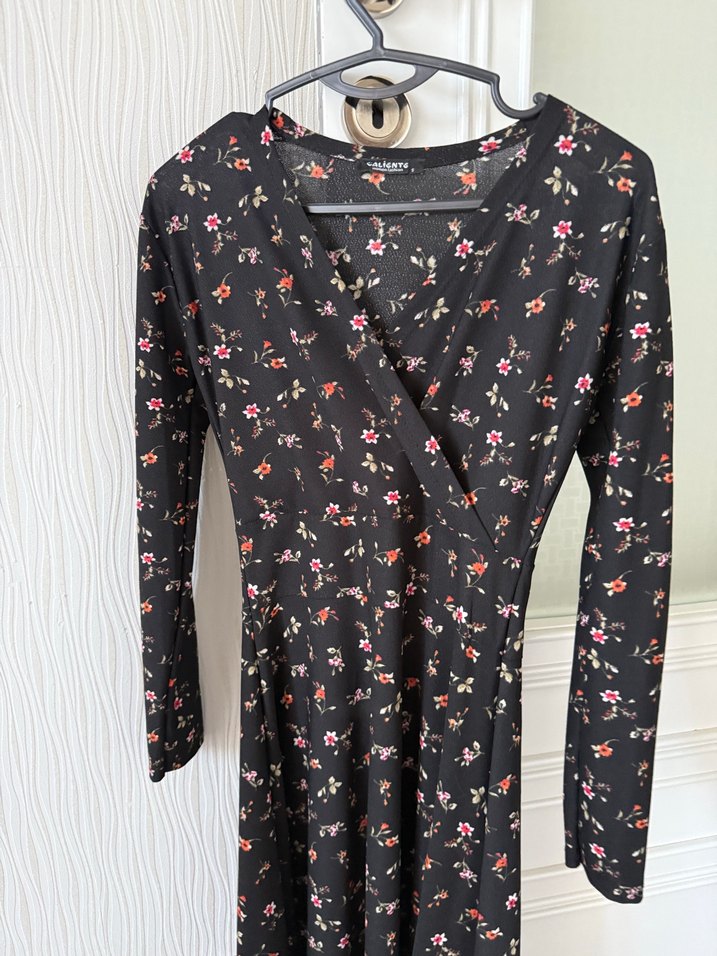 V yaka ve uzun kollu, drapeli kesime sahip siyah, çiçek desenli elbise. Yumuşak sentetik kumaştan, günlük kullanıma uygun.