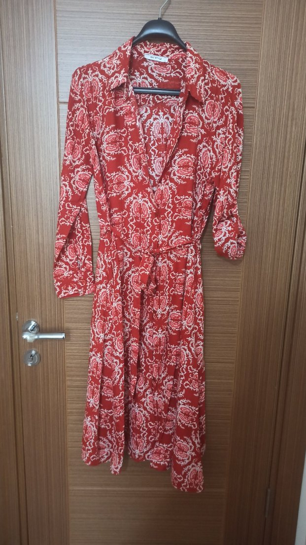 ayarlanabilir kol, uzun kol ve V yakalı, kemerli, midi boy kiremit rengi desenli gömlek elbise